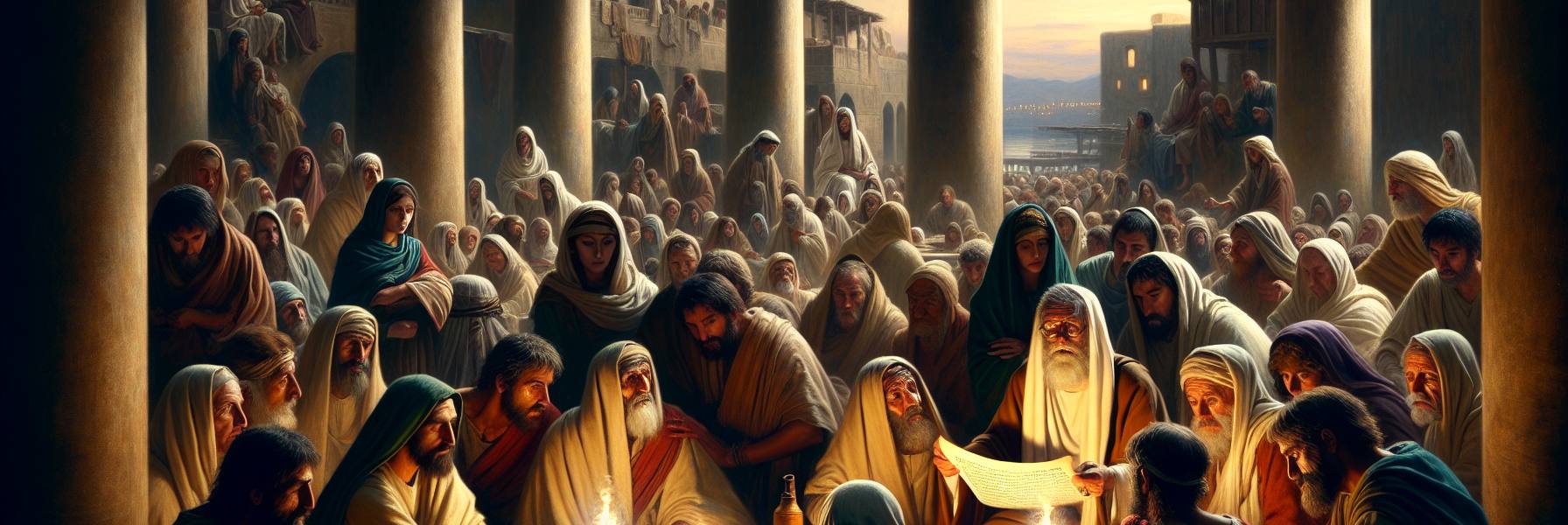 एलियाब ने धैर्य से उत्तर दिया, “भाइयों, हमारा धन तो अस्थायी है। परमेश्वर ने कहा है – ‘जो कुछ तुम्हारे पास है, उससे सब भाइयों के साथ सहभागिता करो।’ हमारी नगरी के बाहर जो कुष्ठ रोगी बैठा है, क्या हमने उसकी सुध ली? कारागार में जो बंधे हैं, क्या हमने उन्हें याद किया?”