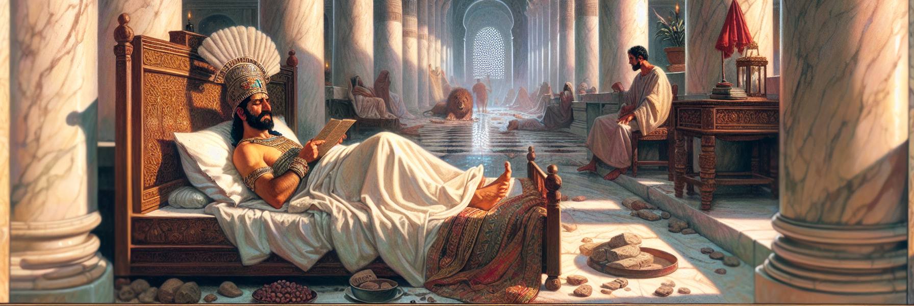 दीपक की टिमटिमाती लौ के नीचे एक लिपिक आया, और उसने पुराने लेख खोले। चर्मपत्रों पर लिखे शब्द धीरे-धीरे हवा में तैरने लगे। कर वसूली, सैन्य अभियान, नियुक्तियाँ… और फिर एक प्रसंग आया—शुशन की राजधानी के फाटक पर बैठे दो राजकर्मचारियों, बिगताना और तेरेश, ने राजा की हत्या की साजिश रची थी। और एक यहूदी, मोर्दकै नामक, ने उसकी सूचना दे दी थी। राजा ने पूछा, “इस मोर्दकै के लिए क्या पुरस्कार या सम्मान दिया गया था?” लिपिक ने पन्ने पलटे। कुछ नहीं। राजा चुप हो गया। उस अशांति में अब एक नाम गूंज रहा था—मोर्दकै।