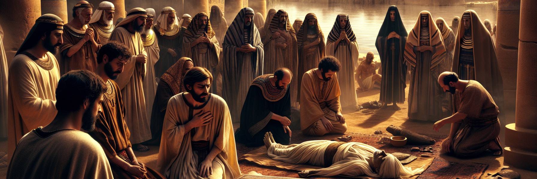 यूसुफ उस शव पर गिरकर रोया, अपने पिता के ठंडे माथे को छूकर। मिस्र की भरी धूप में भी उसे एक कंपकंपी सी लग रही थी। याकूब का शरीर, जो इतने वर्षों तक उसके लिए एक सहारा, एक स्मृति बना रहा, अब सिर्फ स्मृति था। उसने आँखें मूंदीं। पिता की आवाज़ याद आई – वह आशीर्वाद, वह कसम जो उससे गिलाद के पहाड़ पर ले जाने के लिए खाई गई थी।