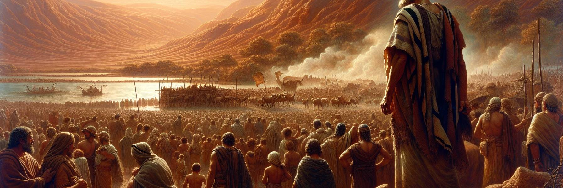 दोपहर की झुलसा देने वाली धूप थी, जो मोआब के उन विस्तृत मैदानों पर पसरी हुई थी। हवा में धूल के महीन कण तैर रहे थे, और दूर जॉर्डन नदी की रेखा धुंधली सी दिखाई दे रही थी। लोग इकट्ठा थे – युवा, बूढ़े, बच्चे, स्त्रियाँ – उम्र और अनुभव से भारी हो चुके मूसा के चारों ओर एक विशाल, अधीर मंडली। उनके चेहरे पर यात्रा की थकान थी, पर आशा की एक चिंगारी भी। वादा किया हुआ देश अब सामने था, बस नदी पार करना बाकी था।