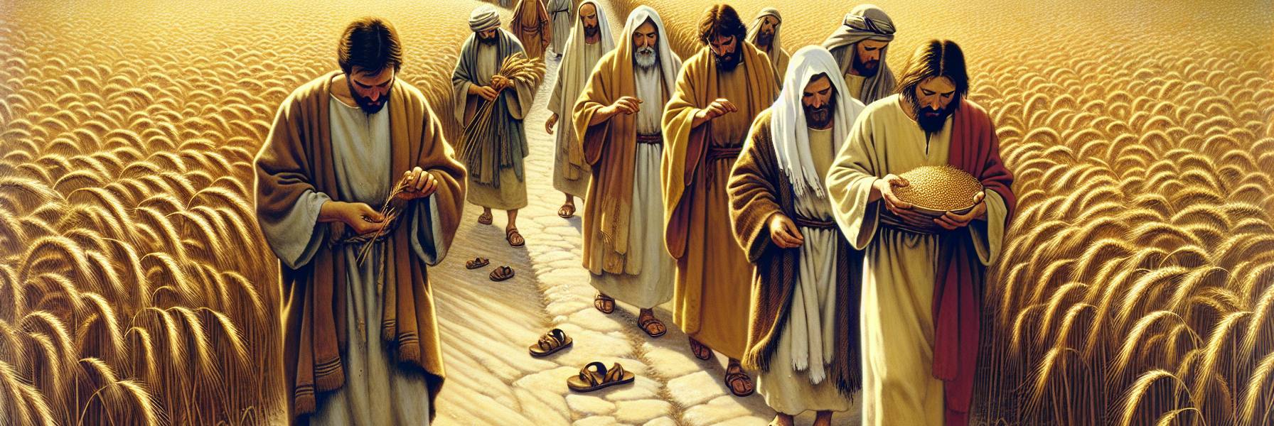 रास्ता खेतों से गुज़रता था। जून का महीना था, और गेहूँ के खेत सुनहरे सूरज की रोशनी में नहा रहे थे। चलते-चलते कुछ शिष्य भूख से बेचैन हो उठे। उन्होंने खेत के किनारे उगे हुए जौ के पौधों से कुछ बालें तोड़कर, हथेलियों में रगड़कर दाने निकाले और चबाने लगे। अचानक कुछ फरीसी वहाँ आ निकले, जैसे वे पहले से ही उस रास्ते पर छिपे बैठे हों। उनमें से एक, जिसकी दाढ़ी बहुत सघन थी और चेहरे पर एक अजीब सी कठोरता, उसने आवाज़ उठाई – “देखो! ये लोग शनिवार के दिन क्या कर रहे हैं? यह तो कटाई का काम है, और यह वर्जित है।”